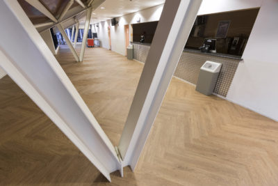 De beschadigde epoxyvloeren in de rustruimten, in het felrood van AZ, werden door de mensen van Erkamp flink onder handen genomen. In het AFAS Stadion hebben ij Forbo Allura Wood LVT-stroken in visgraatmotief verlijmd met 640 Eurostar Special. Verdeeld over diverse ruimten, in totaal 1.000 m². Naast de rustruimten kregen ook de persruimte en de omliggende gangen, ca. 400m², een fraaie opknapbeurt.