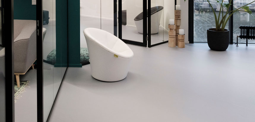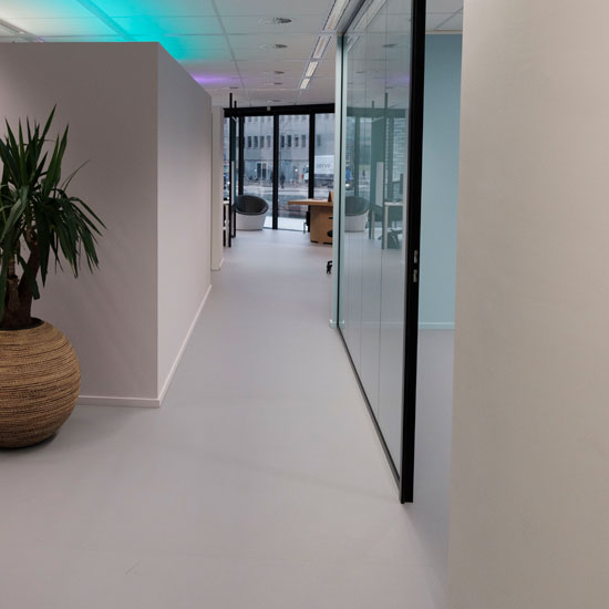 In het kantoor van RMMBR hebben wij 400m² Linoleum, type Uni Walton, gestoffeerd. Deels hebben wij dit om de vaste meubels heen gelegd.