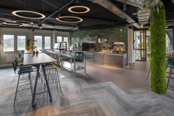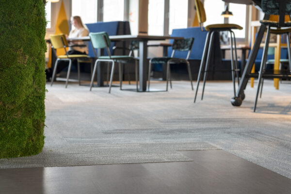 Een combinatie van Looslay PVC-stroken en tapijttegels in verschillende kleuren gelegd in een visgraat patroon maakt het een prachtig geheel. We hebben materialen van THOMSIT Benelux en Interface gebruikt.