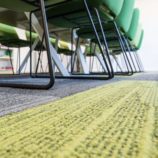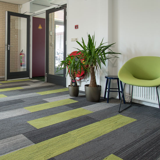 In totaal ca. 240m² Urban Retreat van fabrikaat InterfaceFlor en in de entree een schoonloop Welcome van Forbo Flooring.